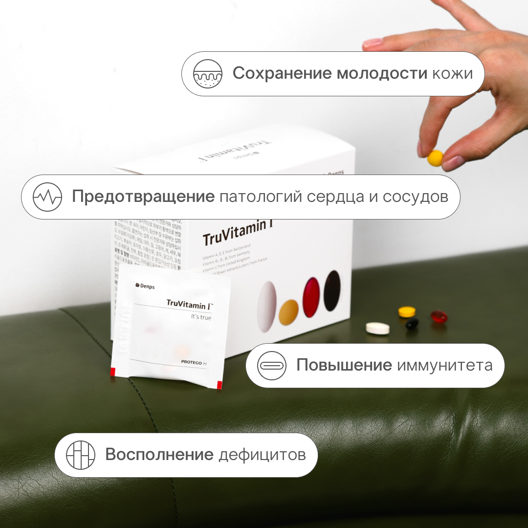 Входящие в состав комплекса витамины улучшают состояние эмали зубов, поддерживают мышечный тонус и продлевают молодость не только всего организма, но и кожи. Комплекс оказывает антиоксидантную защиту и благотворно влияет на функциональность фибробластов, тем самым способствуя активному синтезу коллагена в коже. Улучшает состояние сосудов, снижает уровень холестерина, регулирует артериальное давление и работает на предотвращение патологий сердца и сосудов. Комплекс оказывает иммуномодулирующее действие, усиливает процессы регенерации и восстановления. Улучшает умственную активность, снижает риск развития депрессий и утомляемости.