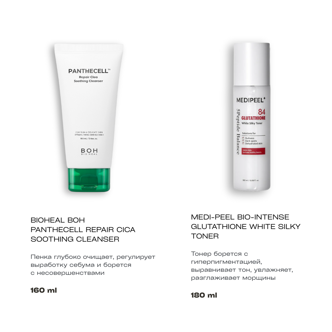 Бокс успешно решает проблемы комбинированной и чувствительной кожи: глубокое очищение, уменьшение воспалений, контроль выработки себума. Активные компоненты выравнивают тон, уменьшают пигментацию и придают коже сияние. Уход восстанавливает водный баланс, укрепляет защитный барьер и обеспечивает глубокое увлажнение.