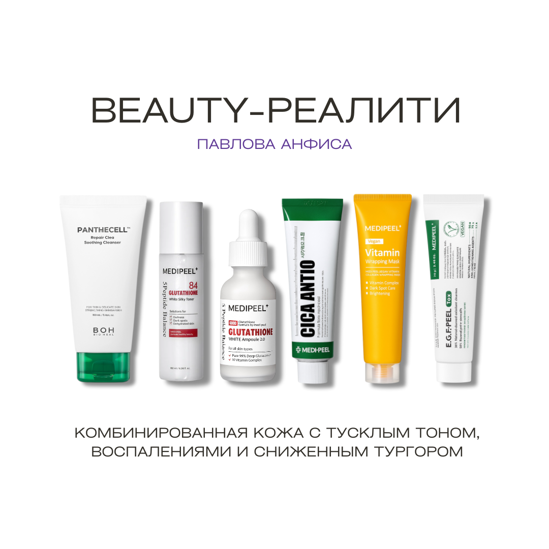 Этот бокс — специально разработанная программа ухода для Анфисы Павловой, участницы нашего проекта. В нём подобраны высокоэффективные средства, направленные на борьбу с жирным блеском, воспалительными элементами, неровным тоном лица и потерей упругости. Особое внимание уделяется улучшению состояния зоны вокруг глаз, работы с синячками и истонченной кожей.